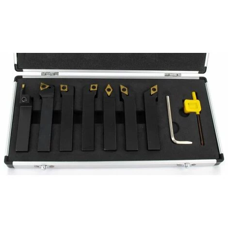 Jeu d’outils de tour de 16 x 16 mm avec plaquettes en carbure, livrés dans un coffre de rangement aluminium avec incrustations.