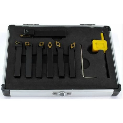 Jeu d’outils de tour de 6 x 6 mm avec plaquettes en carbure, livrés dans un coffre de rangement aluminium avec incrustations.