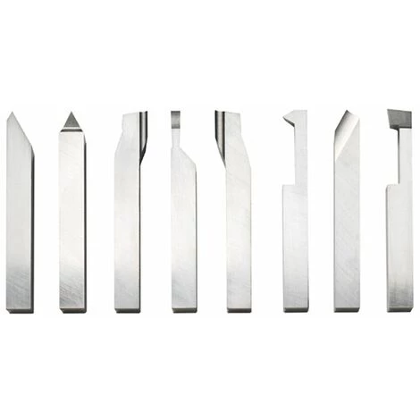 Jeu de 8 outils de tour HSS 8 x 8 mm Avantages: Qualité HSS Exécution monobloc Caisse de rangement en bois Aveccarré 8×8 mm Convient pour: Tournage général dans les aciers ordinaires Chaque tour avec une tourelle carrée ou à changement rapide de 10 mm ou plus Composé de: 1 Outil à charioter-dresser (droite) 1 Outil à charioter-dresser (gauche) 1 Outil de finition 1 Outil à charioter (droite) 1 Outil à fileter à 60° 1 Outil à fileter à 60° 1 Outil à saigner 1 Outil à aléser